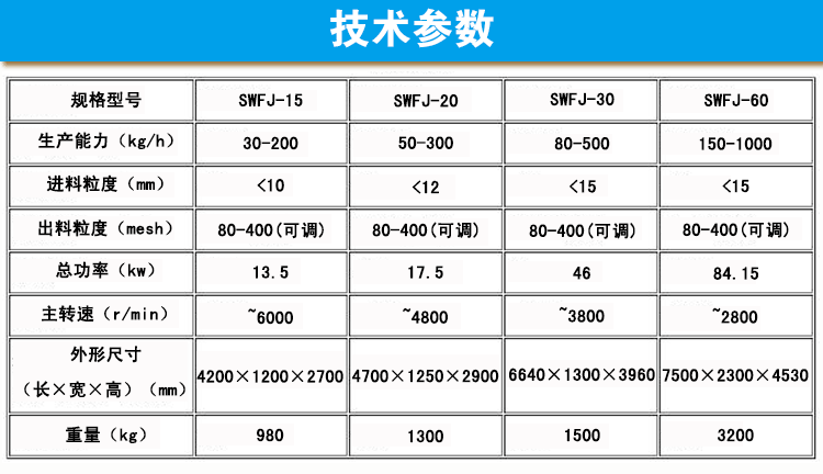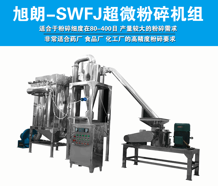 广州星空(中国)生产的SWFJ-15/20/30/60型超微粉碎机组主要适合于粉碎细度在80-400目、产量较大的粉碎 需求,非常适合药厂、食品厂、化工厂的高精度粉碎要求,粉碎细度可随意调节。 该粉碎机组主要由主机、辅机、电控箱三个部分组成,设计紧凑,结构合理,属风选式、无筛网。超微粉碎